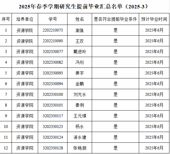 根据学校的相关通知要求,经研究生个人申请,禁漫天堂 初审,禁漫天堂 2023级硕士研究生(不含硕博连读、提前攻博研究生)、2022级博士研究生(不含直博生)、2020级直博生申请提前毕业名单如下,如有异议,请公示期内书面反馈意见至研究生科(联系人:周老师,办公室:主楼336,电话:67883627),公示期即日起至2025年3月2日。