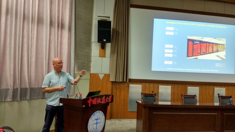 Mark Jessell教授的报告围绕三维地质建模以及地球物理反演的不确定性展开, 主要包括三个方面的内容, 即三维地质建模不确定性的主要来源及定量评价途径、三维地球物理反演不确定性评价以及地质拓扑在地图和模型分析中应用。报告内容丰富,在翔实的案例基础上,从理论构建到实证研究,把握学科前沿,体现了深厚的学术积淀和敏捷的学术思维。在场的师生认真专注,在自由提问环节,Mark Jessell教授针对每一位老师和同学的问题细致认真地分析和解答,精彩的学术报告赢得了在座师生的阵阵掌声。