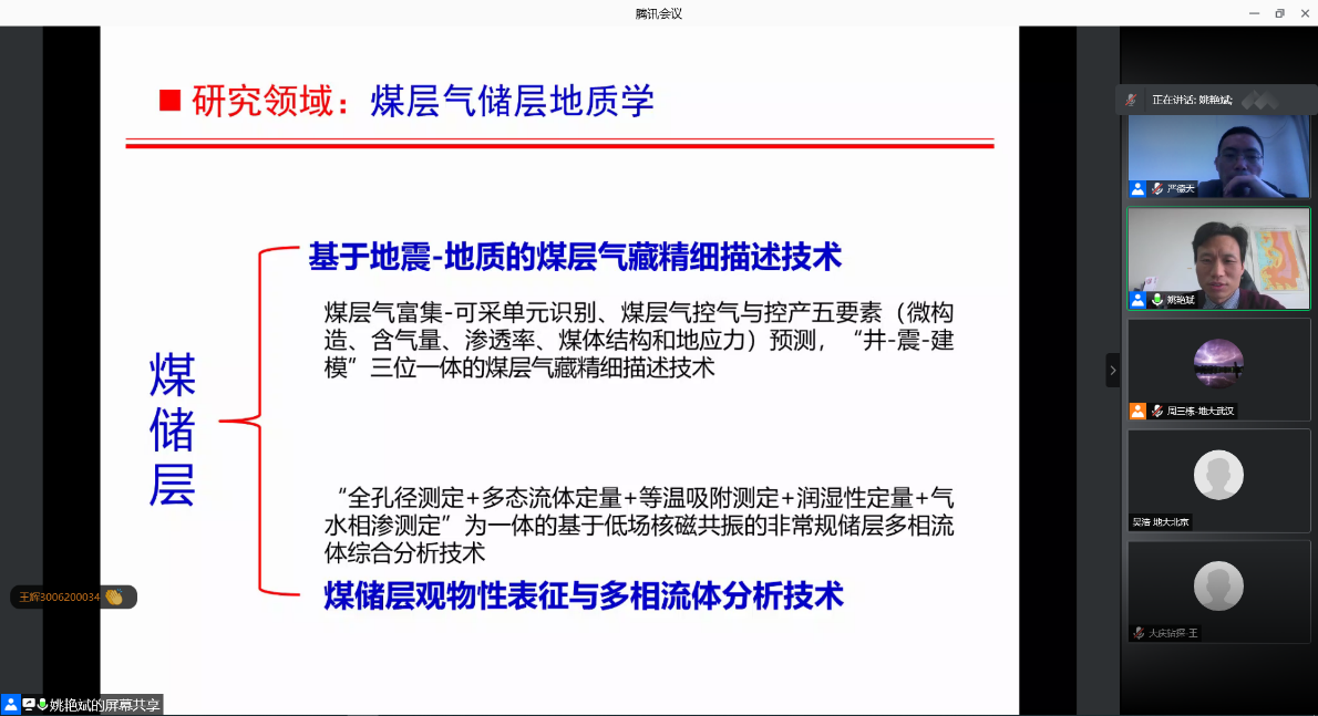 (北京)姚艳斌教授同师生线上交流并作题为“煤储层物性与流体特征分析新技术:核磁共振”的学术报告。