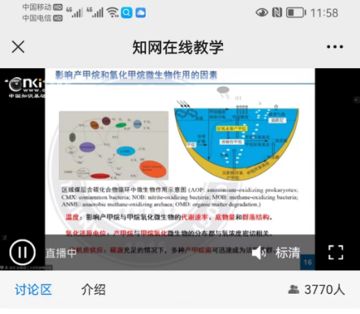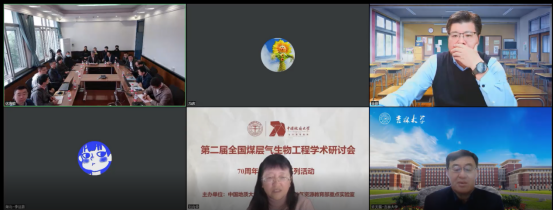 大学余志晟教授、西安科技大学刘向荣教授、昆明理工大学张登峰教授,分别以“数值模拟在CCUS潜力和安全性评价的应用”、“二氧化碳在煤层中的封存研究”、“煤层气原位生物气化研究进展与现场应用方案探讨”、“新疆低阶煤的微生物降解研究”、“煤储层协同埋存富氧燃煤烟气关键组分与驱替煤层气基础研究”等为题作了专题报告。期间,还有来自中国矿业大学(北京)、太原理工大学、齐鲁工业大学、太原科技大学、 河南理工大学、西北大学、 安徽理工大学、中国矿业大学、煤与煤层气共采国家重点实验室等科研院所等15位专家依次做了主题或专题报告。研讨会现场学术氛围浓烈,线上直播平台反应热烈,最高峰有3700多人同时在线交流讨论。