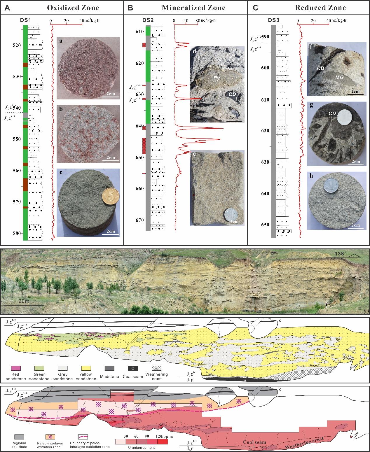 (1)铀储层中可识别出5种地球化学类型砂岩:红色砂岩、绿色砂岩、含矿灰色砂岩、原生灰色砂岩和黄色砂岩(图1)。其中黄色砂岩主要见于地表,红色砂岩和黄色砂岩处于氧化环境,而绿色砂岩和灰色砂岩为还原环境;层间氧化带可被划分为:a.氧化带:红色砂岩+绿色砂岩;b.成矿带:含矿灰色砂岩;c.还原带:原生灰色砂岩。