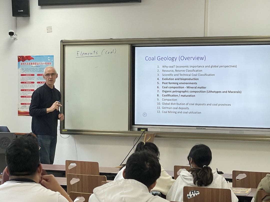 10月24日,Dr.Krooss在东区综合楼B0110为盆地矿产系21级、22级本科生讲授了一堂生动的煤地质学课程。Dr.Krooss循序渐进地介绍了煤的演化和生物合成、泥炭的形成环境、煤岩石组分以及煤化作用和成熟度等理论知识。让学生们对这个领域有了更深入的理解,同时也激发了他们对煤地质学的浓厚兴趣。课程结束后,学生们与Dr.Krooss合影留念。