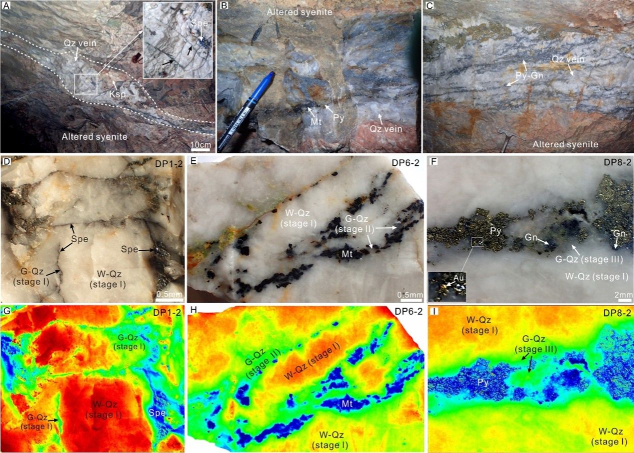 (武汉)李建威教授团队的范高华博士以河北东坪超大型金-碲矿床(~120吨金和~225吨碲)为研究对象,综合了不同共生阶段多世代石英的微结构特征、流体包裹体、微量元素地球化学以及原位氧同位素分析,为金成矿流体的来源和复杂演化提供了重要见解。这些结果还用于揭示导致金沉积的机制。最后讨论了该方法在追踪脉状金矿床中流体流动及其微观变化方面的潜在应用。所研究的三个石英脉样品取自Au-6矿区的70号矿体(图1a-1c),它们分别代表第I阶段(样品DP1-2)、第II阶段(DP6-2)和第III阶段(DP8-2)。这些样品均含有第I阶段的乳白色石英(图1d-1f)和细脉状的烟灰色石英(图1g-1i)。第I阶段的石英通常与镜铁矿共生,而第II阶段和第III阶段的石英则分别与磁铁矿和含金硫化物共存(图1e-1i)。