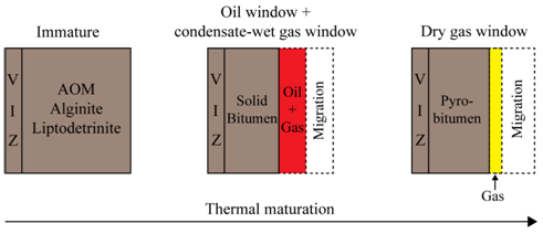 泥页岩中的分散有机质包含5个显微组分组:镜质体、惰质体、类脂体、动物碎屑和次生有机质,每个显微组分组包含多种显微组分(表1)。不同显微组分的成因不同,生烃潜力也存在差异:类脂体生烃能力最高,镜质体和动物碎屑次之,惰质体基本无生烃能力。热演化过程中,镜质体、惰质体和动物碎屑的形貌特征未表现出明显变化,在过成熟泥页岩中仍可识别出这三种显微组分组(图1)。而类脂体在热演化过程中形貌特征变化较为显著。生油型显微组分在生油窗内通过沥青化过程转化为前油沥青,随着成熟度的增加,前油沥青逐渐转化为油气和后油沥青,后油沥青在干气窗内转化为焦沥青,同时油也会在干气窗内二次裂解为焦沥青(图2)。