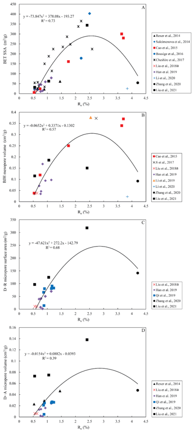 图3页岩中有机质孔隙结构随成熟度增加的演化特征。(A)BET比表面积;(B)BJH中孔孔容;(C)D-R微孔比表面积;(D)D-A微孔孔容。