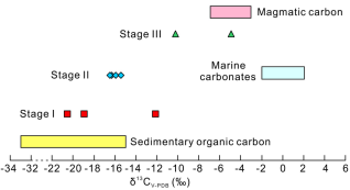 (3)石英的H-O同位素、黑钨矿和锡石的O同位素结果表明,阶段Ⅰ的成矿流体(δ18O流体=3.3-7.0‰,δD=-76 ~ -61‰)主要为岩浆水;阶段Ⅱ(δ18O流体=1.3-1.8‰,δD=-81 ~ -71‰)和阶段Ⅲ(δ18O流体=-3.1 ~ -1.6‰,δD=-89 ~ -73‰)的成矿流体的δ18O流体和δD值逐渐降低,表明阶段Ⅱ开始有大气降水加入,并在阶段Ⅲ大气降水占主导地位(图4)。石英流体包裹体中提取的CO2的碳同位素组成(δ13Cco2=-20.5 ~ -4.9‰)表明,阶段Ⅰ的成矿流体主要为岩浆水,其碳同位素组成由于沉积地层中有机碳的混入而发生改变,加入的有机碳随着时间推移被逐渐消耗,在阶段Ⅲ几乎消耗殆尽(图5)。
