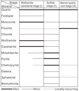 (1)Hermyingyi是一处典型的石英脉型W-Sn矿床,矿脉主要赋存于晚白垩世二长花岗岩中。根据野外穿插关系和镜下矿物共生组合以及矿物结构的详细观察,将成矿作用过程划分为三个阶段:黑钨矿-锡石阶段(阶段Ⅰ)、硫化物阶段(阶段Ⅱ)和无矿石英脉阶段(阶段Ⅲ)(图2)。