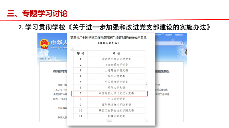 支部副书记李占轲领学学校《关于进一步加强和改进党支部建设的实施办法》,与会党员围绕“教职工党支部考核评价指标体系”展开热烈讨论和交流,会议一致认为《实施办法》充分体现了在新时代背景、新指导思想、新发展理念、新建设要求下党支部建设的目标体系、考核办法、奖惩机制,以高质量的“标尺”引领和驱动高水平党建工作,为支部建设树立了鲜明的目标导向,支部在今年的组织建设、制度建设等方面的工作中将加强贯彻落实文件精神,为培育创建样板支部打下坚实基础。