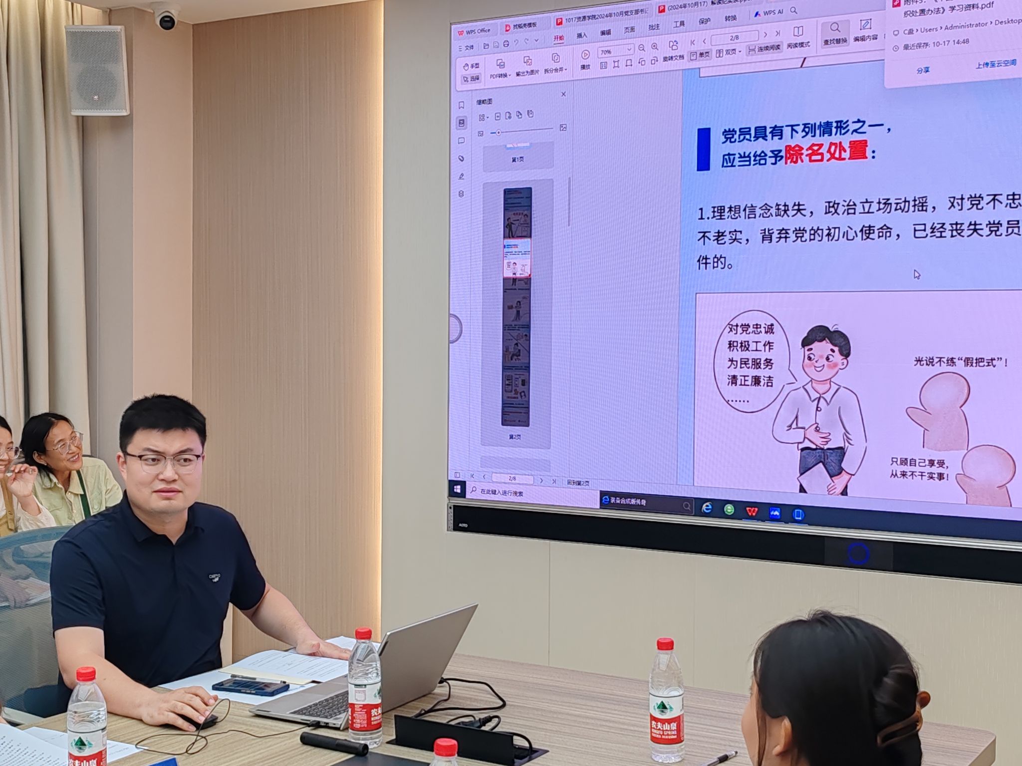 彭鑫对《中国共产党不合格党员组织处置办法》进行解读。他表示办法旨在强化党性教育与纪律建设,确保每一个党员都能在思想上、行动上与党中央保持高度一致,是加强党员队伍建设的重要环节。随后,他介绍了本学期党建工作安排,并希望各党支部围绕专业特点和具体实际,开展丰富多彩的党支部活动,打造禁漫天堂