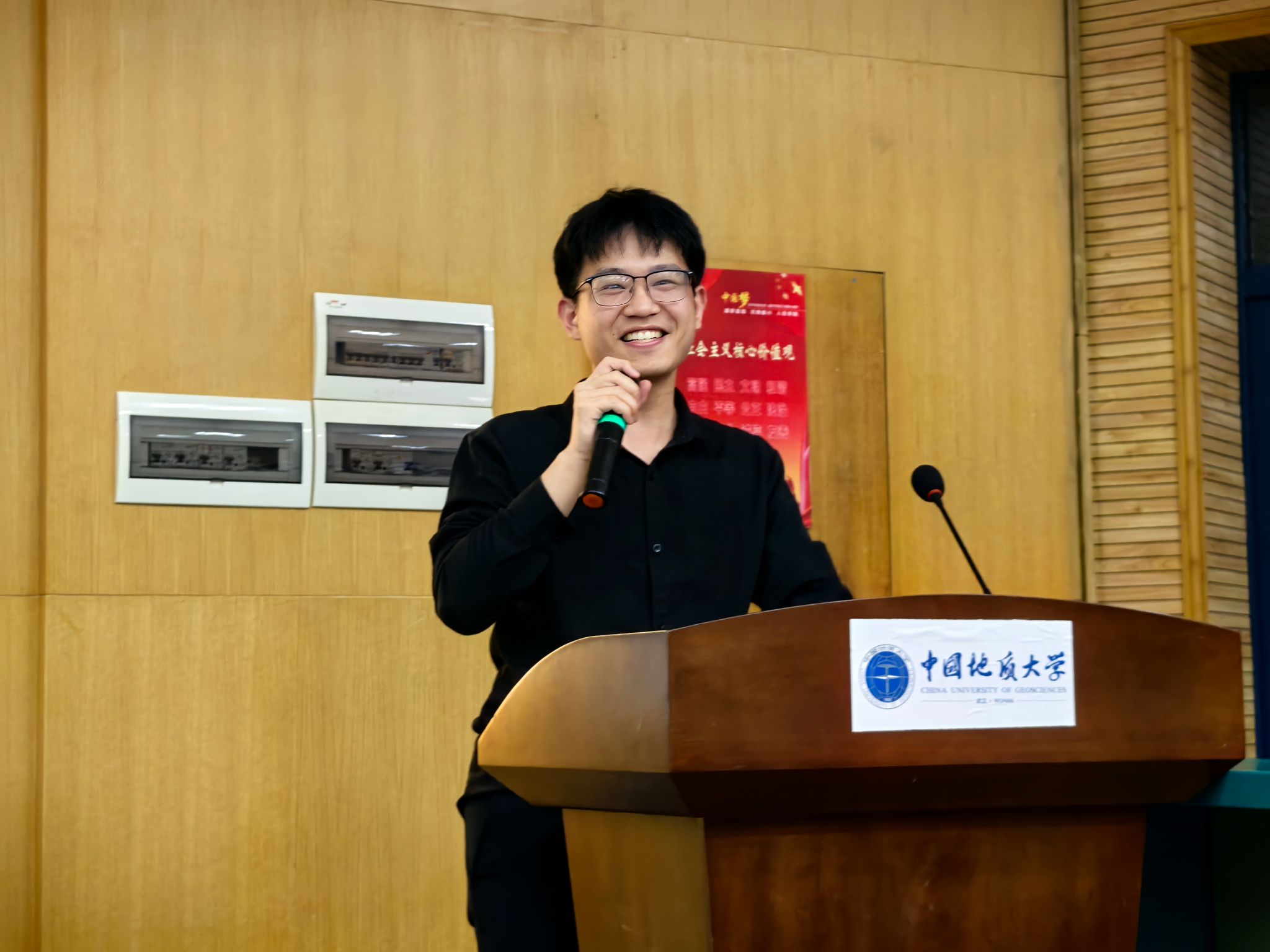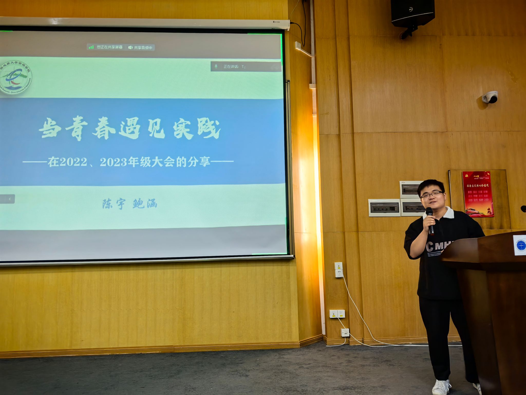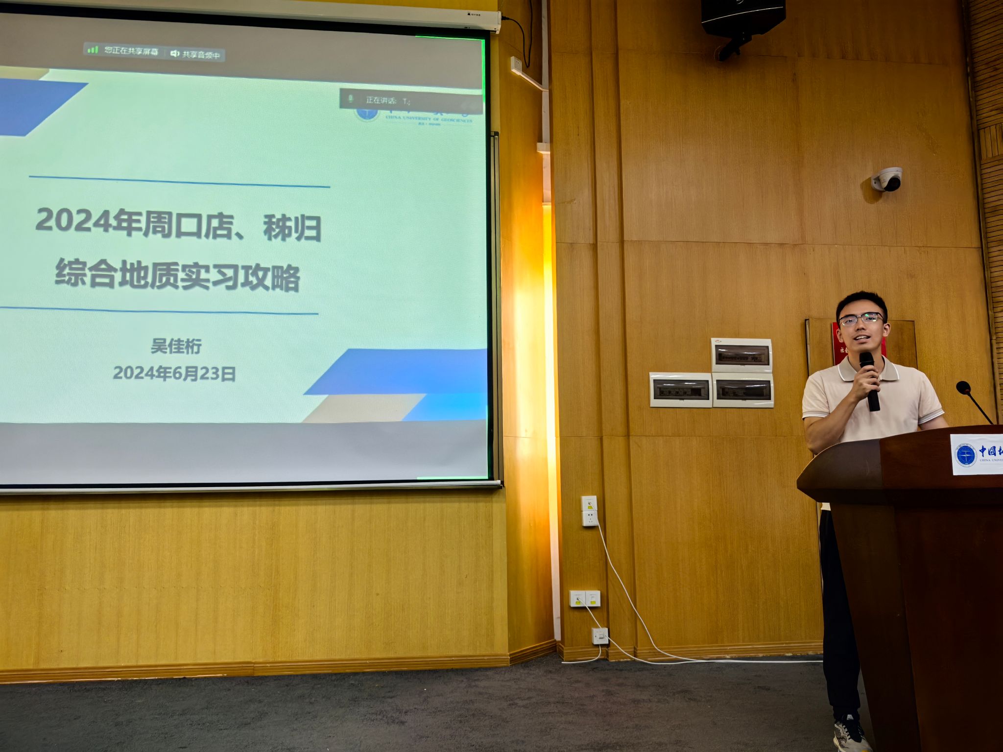 勘查工程专业(基地班)学生代表吴佳桁作《周口店、秭归攻略》实习主题分享。他从实习纪律与安全、实习生活用品、基地生活情况、注意事项四个方面着手,为低年级同学精心准备了一份宝贵、实用的综合实习地质攻略。
