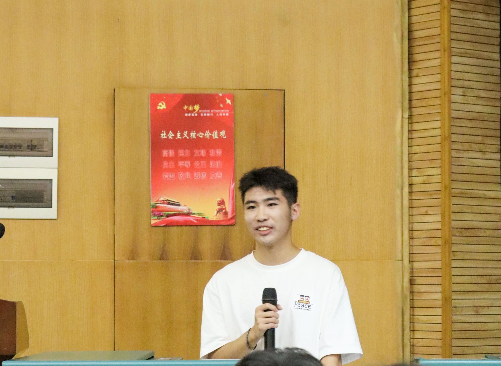 2023级学生代表敖扬洋作《别样的“武功”》安全主题分享。他分享了与朋友登武功山突遇强风大雨恶劣天气的短视频,提醒同学们徒步不是简单的打卡运动游玩,要做好充分的准备和预案,并增强实习期间的安全防范意识。