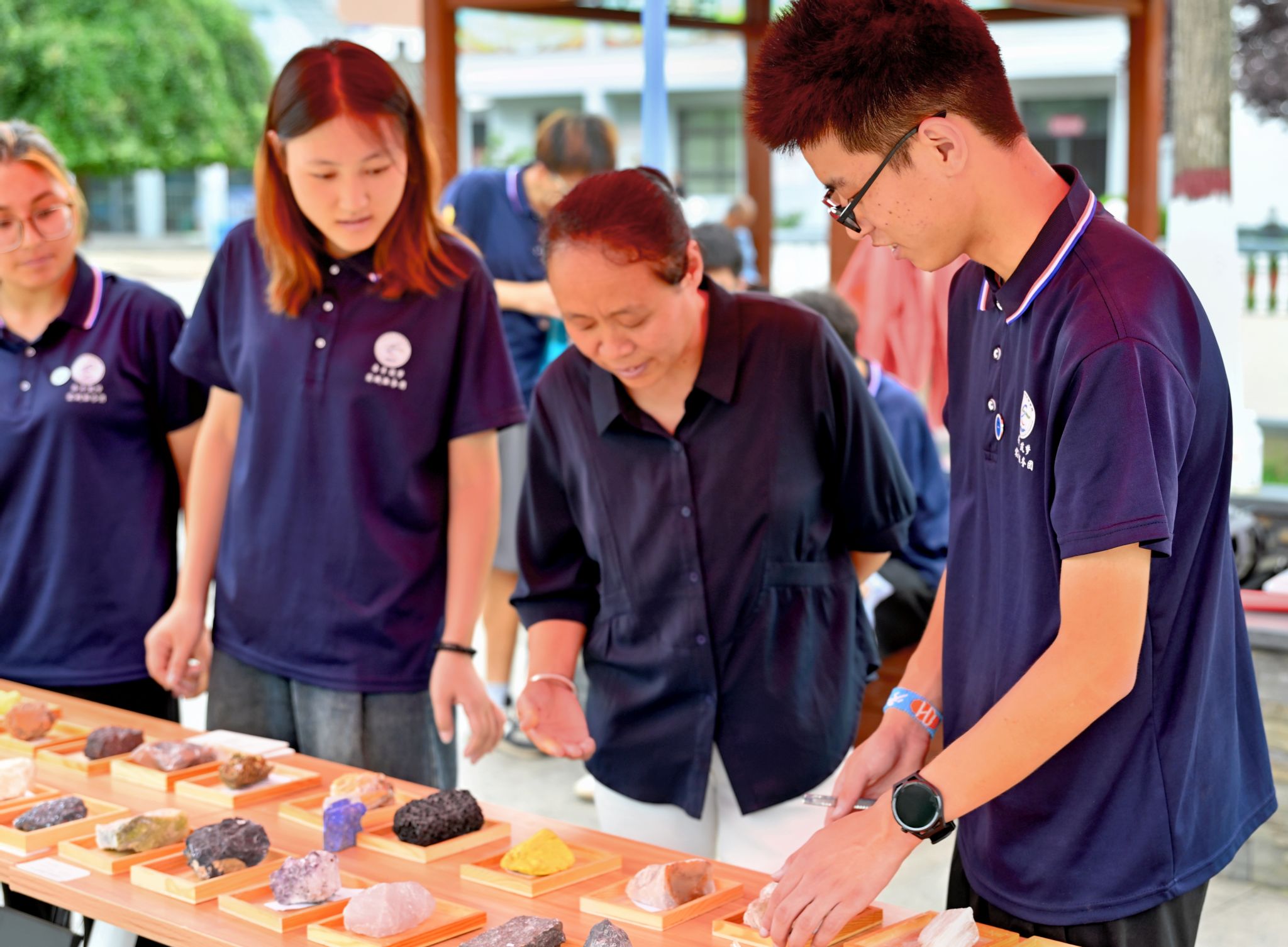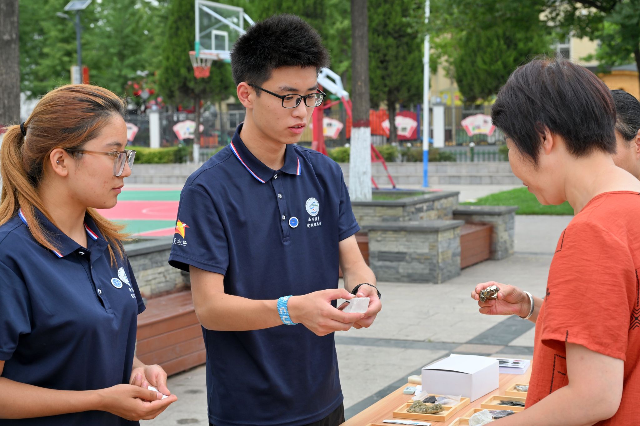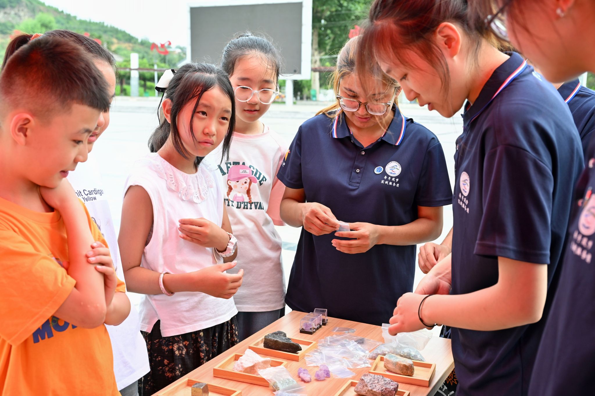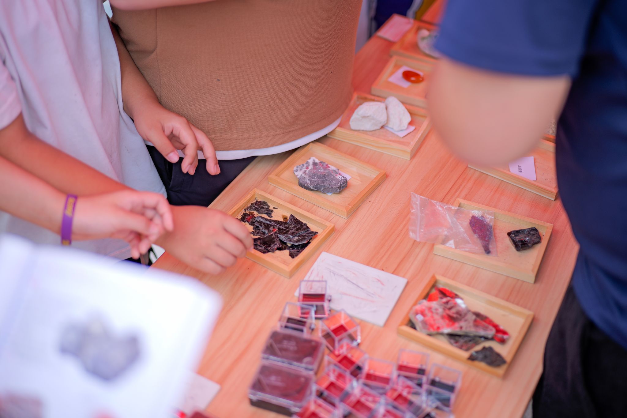 实践体验区让科普更加生动有趣。团队成员为参与者讲解放大镜的使用方法,用别样的视角观察矿物,带领小朋友们用小刀、瓷板判断矿物的硬度,体验矿石鉴定的乐趣。