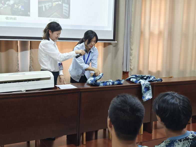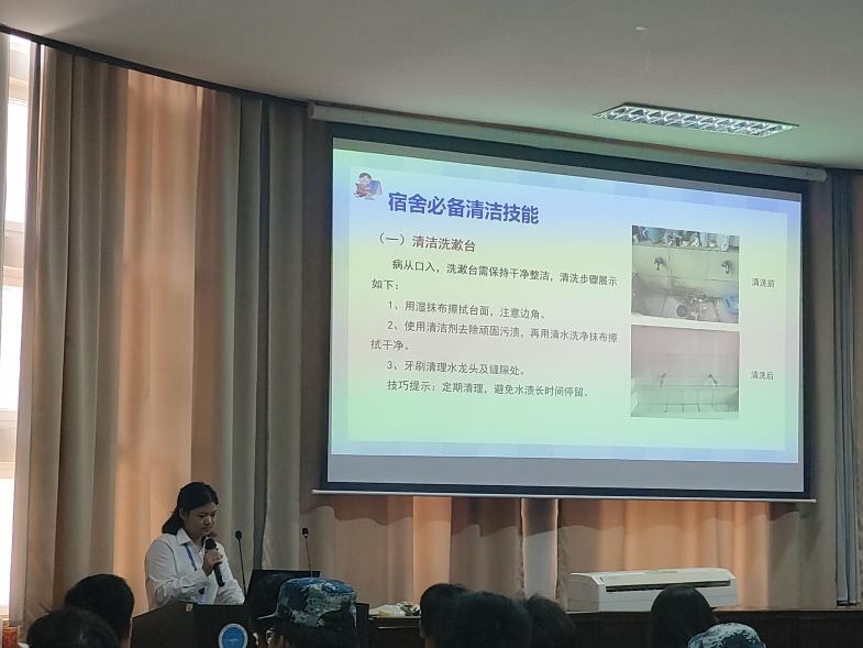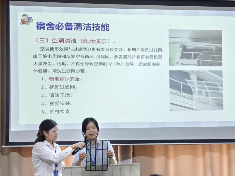 本次劳动技能比赛活动内容丰富,包括劳动授课、有奖竞答和技能比赛。在授课环节,中心住宿部副经理胡海艳从劳动工具的用途、必备清洁技能及经验技巧等方面进行详细的讲解,旨在帮助同学们掌握劳动技能,共同创造美好的居住环境。她还特别邀请了一线员工钱瑾、潘芙蓉,现场演示叠衣服、洗空调、擦玻璃等实用的劳动要领,熟练的技能展示赢得现场阵阵欢呼。