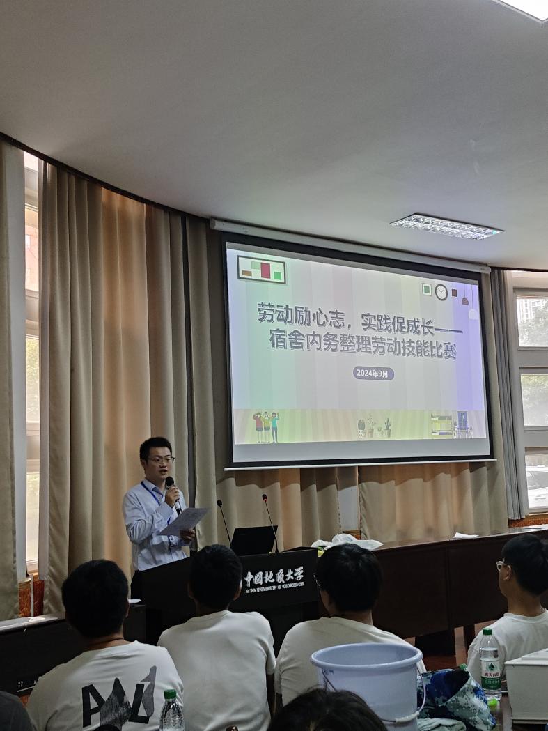 辅导员彭鑫老师对比赛进行点评。他为今日积极参与活动的同学们点赞,并希望同学们以此次比赛为契机,养成整理内务的生活习惯,积极参与宿舍、学生社区的各项建设中去,共同打造文明、和谐、团结的学生社区。