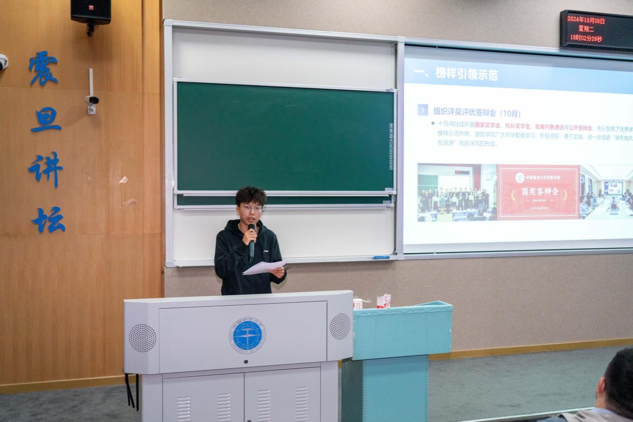 学生会妥致忠从榜样引领示范、学习能力培养、强化课堂管理、结对困难帮扶四个方面介绍了2024年秋季学期学风建设系列活动。