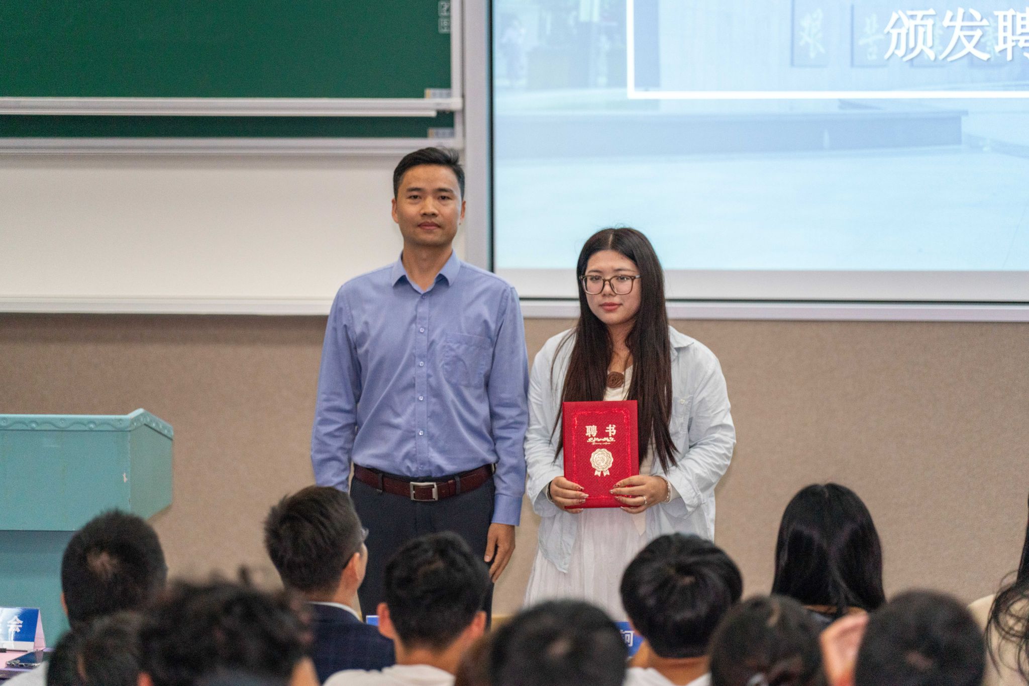副院长李占轲为学生课堂巡查组代表颁发聘书。学生课堂巡查组由各班级驻班党员构成,常态化深入课堂了解学生上课情况,强化课堂管理和学生纪律意识,营造良好学习氛围。