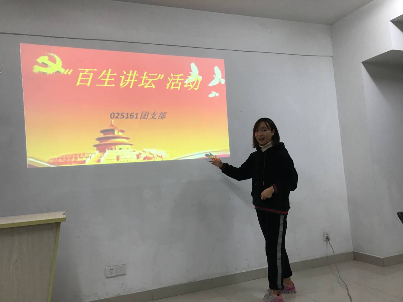 开学初,910月份025161团支部进行巡讲指导团会,团会内容主要是关于“学习习近平总书记的系列讲话,喜迎十九大”。此次巡讲过程之后,有8位同学成为此次的演讲比赛选手,他们将在十九大结束后,去认真观看并阅读此次十九大和相关文件。因为其将举办主题为“学习十九大我最行”的演讲比赛,同时首创观众评述比赛,大份的奖励吸引着不少同学前去观看。所以除了比赛选手,不少想成为比赛观众的同学也在慢慢细读十九大,甚至有些从不关心政治的同学,也因此次比赛的奖励而去学习。当然学习十九大的主要内容特别是习近平总书记的报告需要相关的知识,所以又有不少同学又去温故了往届的党代表大会内容。充分地调动的同学们的政治思想和政治积极性,在思想上跟着党组织走,更向党组织靠拢。