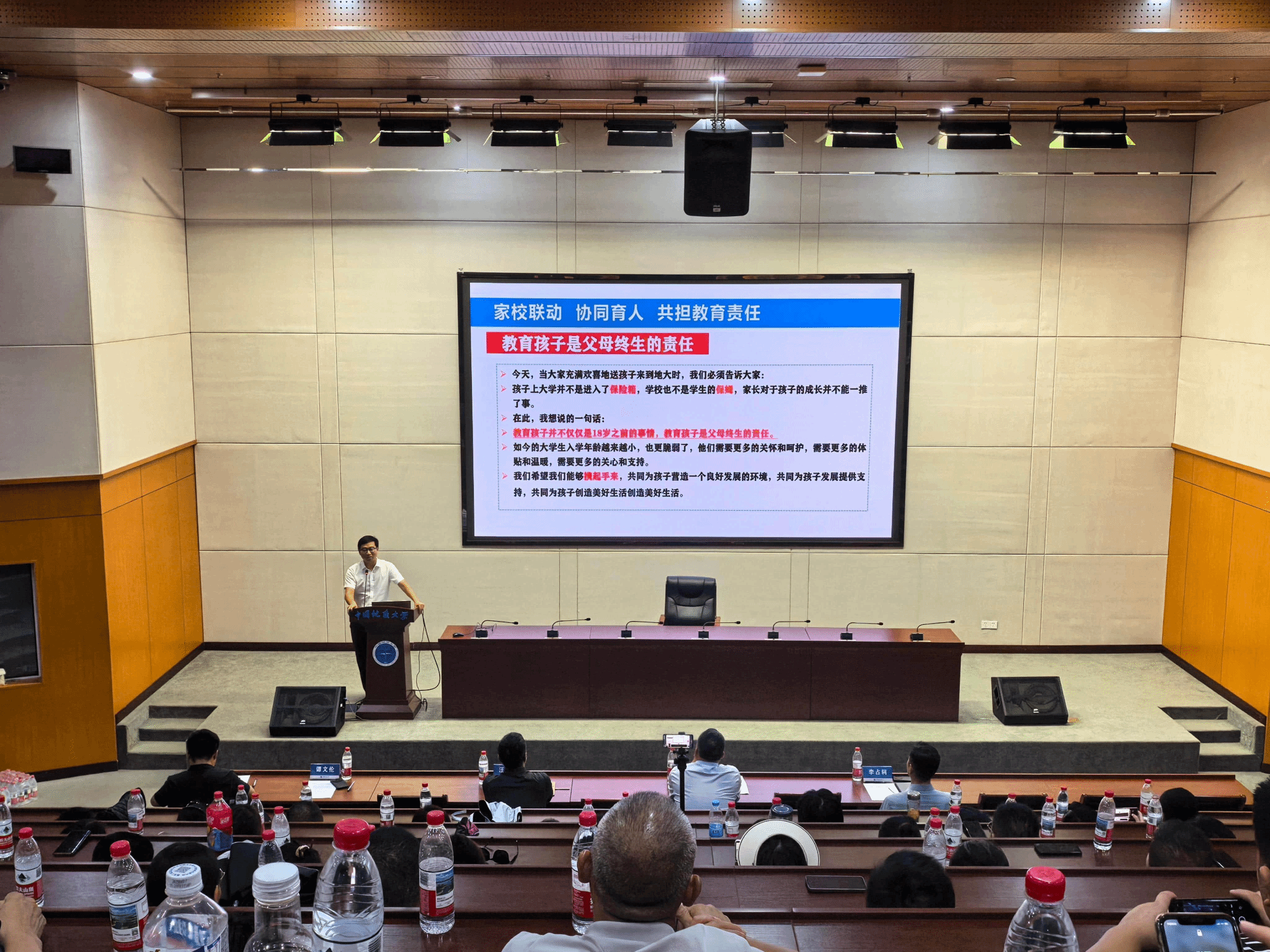 党委书记汪再奇、院长朱红涛、党委副书记谭文伦、副院长李占轲、2025级辅导员陈宇和新生家长参加会议。陈宇主持会议。