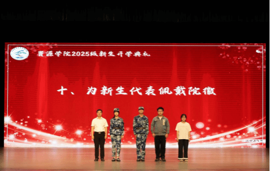 党委书记汪再奇老师为新生代表佩戴院徽。