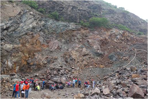 ,是专业实践的理想场所。本次实践教学由毕诗健队长带队,皮道会和曹晓峰副教授担任现场教学指导。实践教学以认识矽卡岩型铁矿床地质特征为目的,围绕接触带、矿体、矿石、蚀变等知识点展开。通过本次实践教学,一方面加深了学生对专业知识的理解,另一方面培养了学生观察和描述能力,锻炼了学生矿床学思维。