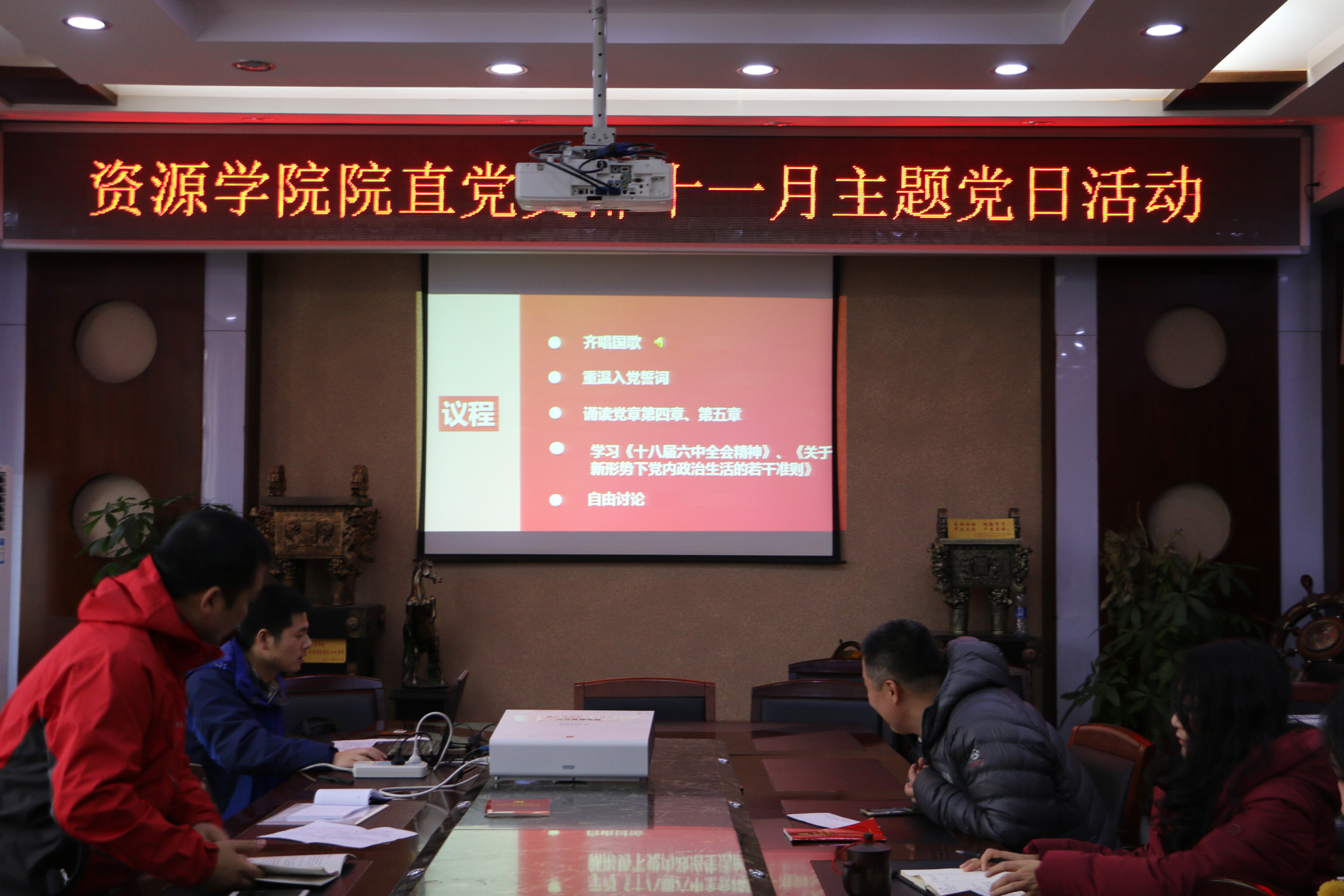 活动中,全体党员按照要求,齐唱国歌,重温入党誓词,逐个诵读了党章,交纳11月党费。此外,与会党员认真学习了十八届六中全会精神。支部宣传委员章帆给大家分享了《关于新形势下党内政治生活的若干准则》的学习体会。章帆首先介绍了《准则》出台的背景和《准则》的基础知识,随后重点分享了《准则》的主体内容,《准则》从坚定理想信念、坚持党的基本路线、坚决维护党中央权威等十二个方面对严肃党内政治生活作出了规定。章帆分享结束以后,支部成员进行自由讨论。郭秀蓉指出:重新梳理《准则》对于加强党员管理非常重要,十八届六中全会就是以制定党内政治生活准则和修订党内监督条例为重点研究从严治党,这也是四个全面战略布局的重要一环。活动最后,张建华带领大家重温了“四讲四有”的内涵,支部成员随后也进行“四讲四有”专题学习讨论。