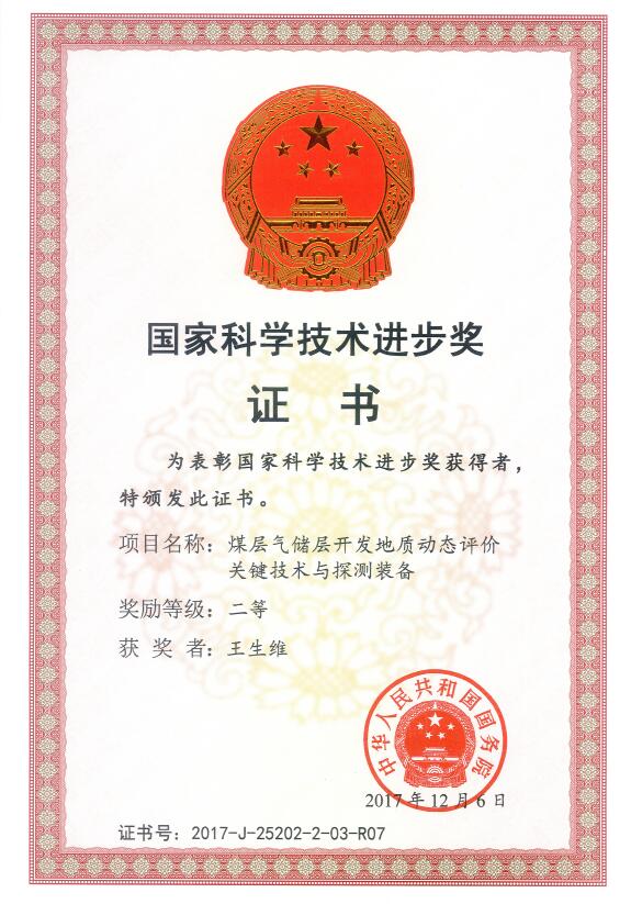 2018年 1 月 8 日,2017 年度国家科学技术奖励大会在北京隆重举行。禁漫天堂 王生维教授与中国矿业大学等单位合作完成的“煤层气储层开发地质动态评价关键技术与探测装备”项目获得国家科技进步二等奖。