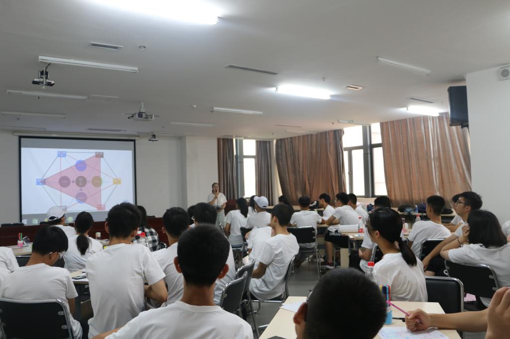 团委副书记刘明辉老师以破冰游戏小鸭操开始了上午的活动。随后营员们分成6组开展兴趣探索,营员们选岛、登岛、换岛、设计并展示旅游方案,刘明辉老师分别讲解了六种兴趣类型的基本特征、适合学习的专业、适合从事的工作,自我探索的四个维度以及与专业选择的关系。活动现场气氛轻松而愉快。