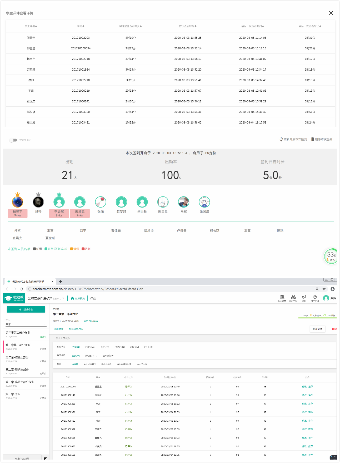 一方面,我们选择了“微助教”网络平台,将学习材料上传到微助教平台上供学生在线学习,实时监测学生在线学习的时间,同时针对教学重点,设置课程作业,供大家练习巩固学习效果;另一方面,构建了课程QQ学习群,在QQ上进行教学重点内容发布、交流讨论等。此外,还充分利用“微助教”网络平台的签到功能,严格考核,并与辅导员密切沟通,确保学生全程参与课程学习。