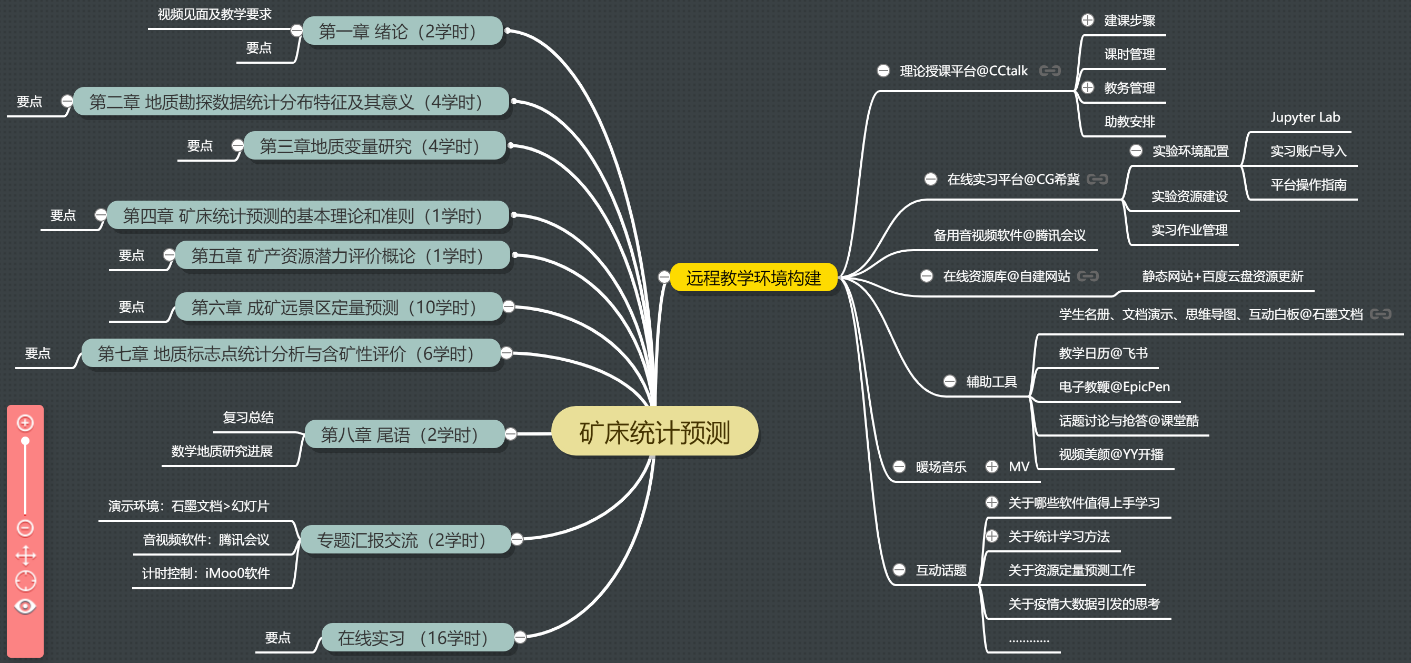 大三学生讲授专业课《矿床统计预测》,共有48个学时,其中理论授课32学时,实习16学时。分两个教学班:卓越班(026171, 026172,39人选课,第3周~第11周)及基地班(020171, 20人选课,第7周~第16周)。该课程具有综合性强、跨学科、重实践的特点,教学实习内容一般可以不涉及地质实物资料,因此利用矿产勘查数据资料借助计算机软硬件设备能够完成有关矿产预测方法实习。目前,卓越班教学班的授课已经过半,开展了两次远程实习教学,基地班教学班刚完成首周授课,经过了前期信息化教学技术的学习和摸索,努力构建了理论与实践并重的远程教学解决方案,凸显信息化特色与优势,加强师生互动。在此和老师们分享一些经验与体会。