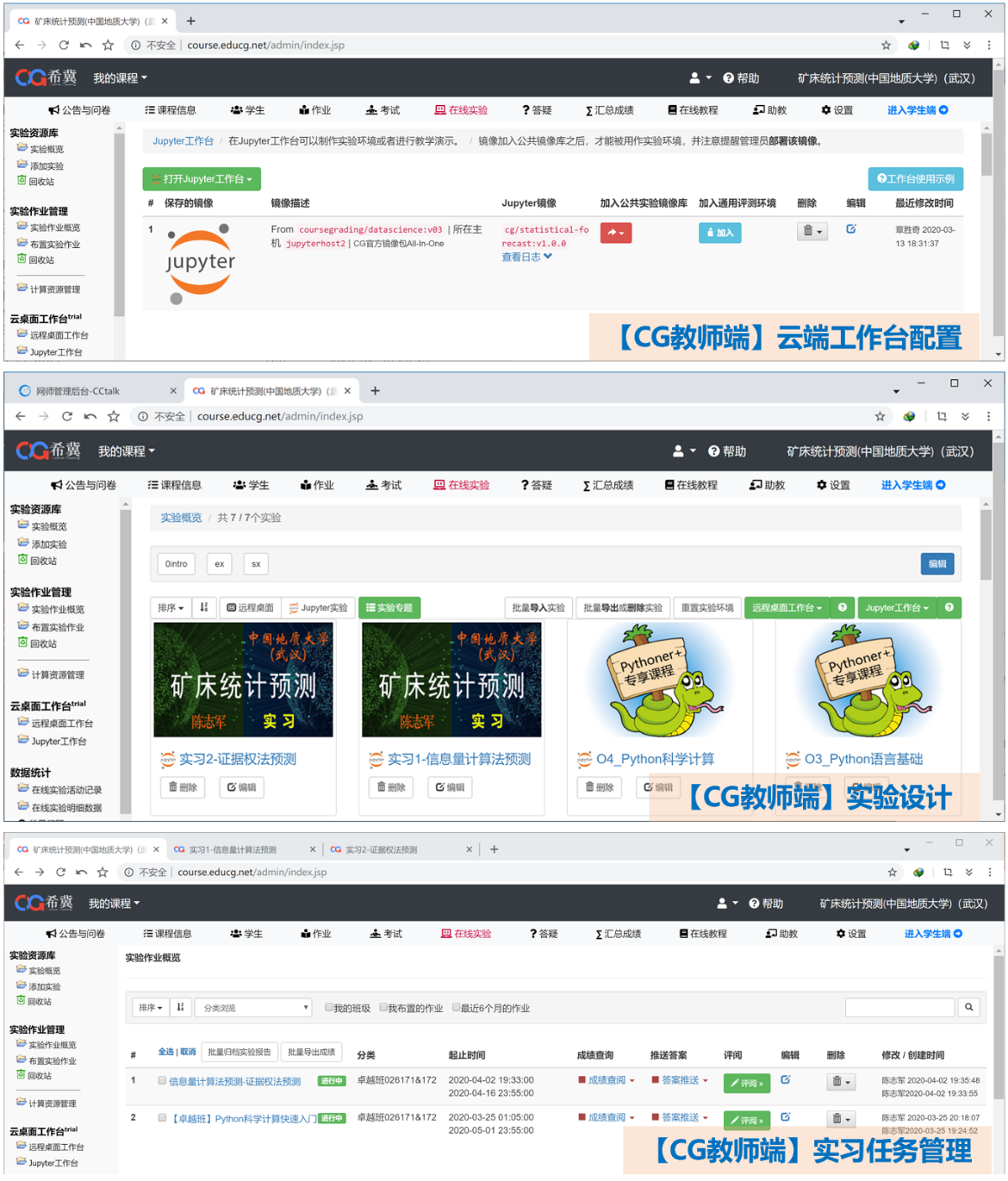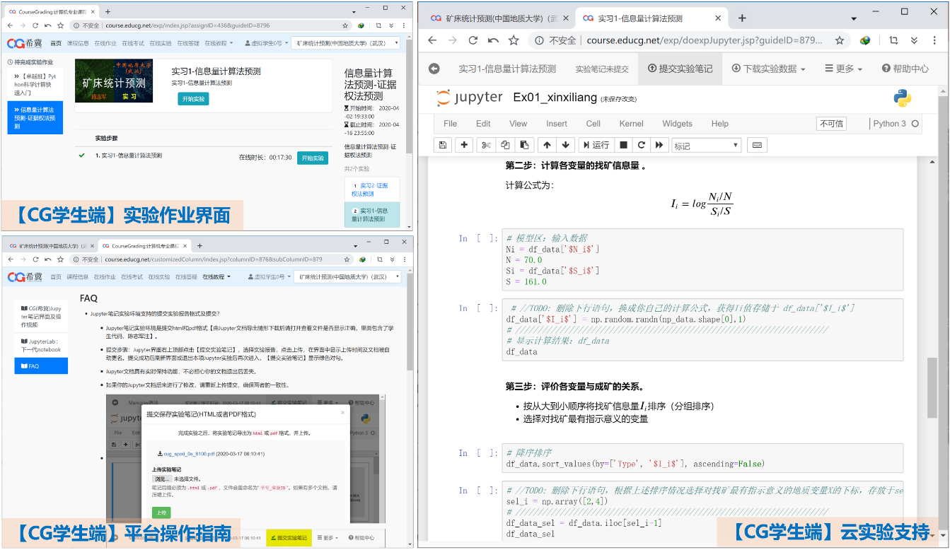 在《矿床统计预测》实习环节,顺应地学大数据发展趋势,本人采用Python技术更新了原有的实验材料。有近十位学生反馈他们的电脑不能成功安装Anacoanda科学计算环境,为此,认真调研云端实习的解决方法,最终选择北航希冀(CG)在线实验平台来完成教学实习环节。CG平台是一个国内既专业又有温度的计算机类课程一体化支撑平台,定位于全面支撑计算机、人工智能和大数据专业建设的大型综合教学实验平台,全面支持Jupyter Notebook科学计算环境的在线运行。本人将实验禁漫天堂