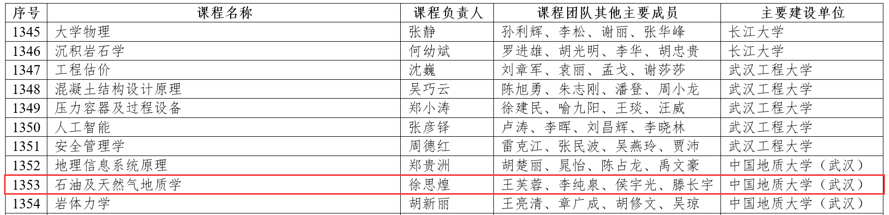 共享课,2021年获批湖北省线下一流课程,其课程思政教育探索与实践获批2020年湖北高校省级教学研究项目,“石油及天然气地质学课程组”2022年获评湖北高校省级优秀基层教学组织。课程负责人徐思煌教授2020年入选“湖北名师工作室”主持人、湖北名师。