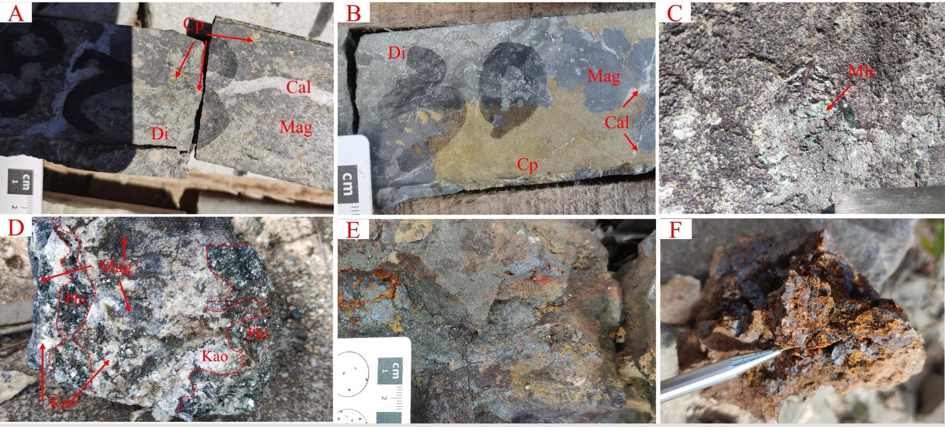 量的49%和44%,铁银储量也达到大型规模,是国内少有的铜铁金超常聚集区。7月8日至15日,谭俊老师带队,基地班傅炳臻、冯佳鑫、黄中泽、李龙鹏、黄金贵、杨翱等6名同学组成实习小组。首先学习矿山钻探工作中的钻孔编录方法,提高学生的实践能力,同时对研究区的矿化分带有一个初步地认识,在此基础上安排学习化验样品和矿床地球化学研究样品的规范采集;第二部分是参观铜绿山古铜矿遗址,了解千年矿山的采冶和现代化勘探采矿的风采,随后实地观察野外矽卡岩型接触带、野外露头、赋矿围岩和矿石特征,统计近矿岩体、地层蚀变类型和组合;第三部分是实地调研区内其他成矿类型的矿床,拓宽学生对不同类型矿床的见解。