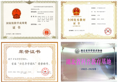 勘查课程虚拟教研室”,1门课程获批湖北省一流课程,1个实验教学中心获批湖北省科普教育基地。1个教学团队获批湖北省高校省级教学团队。1项成果获得国家级教学成果二等奖、湖北省高等学校教学成果特等奖和学校教学成果特等奖。