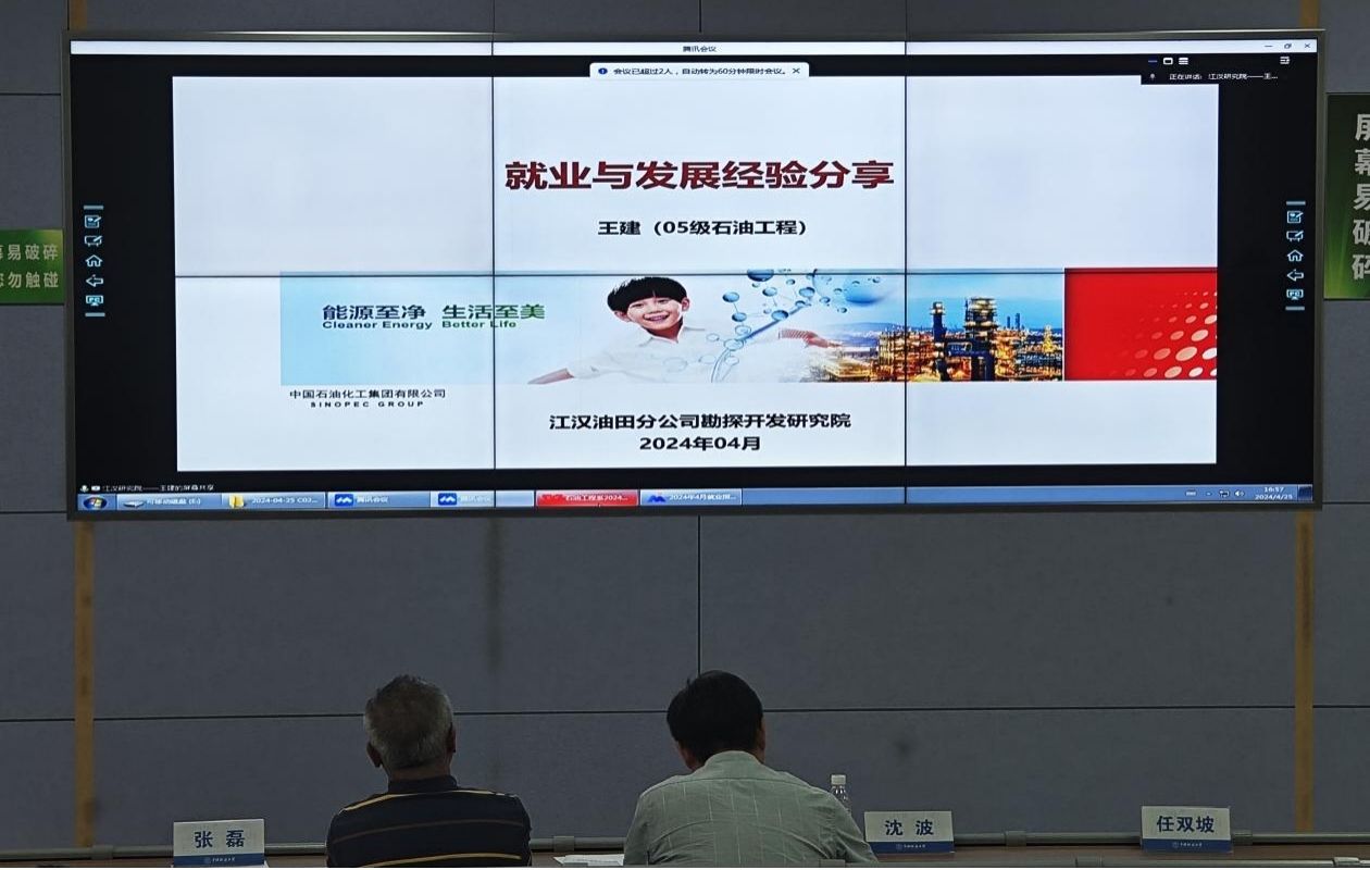 优秀校友中石化西北油田分公司秦飞、中石化江汉油田分公司王建,分别结合自身工作与成长经历,作就业与发展经验分享。秦飞从求职面试和职场从业心得、油田成长环境与发展空间、企业急需人才类型与特点等方面分享了个人在就业方面的心得体会。