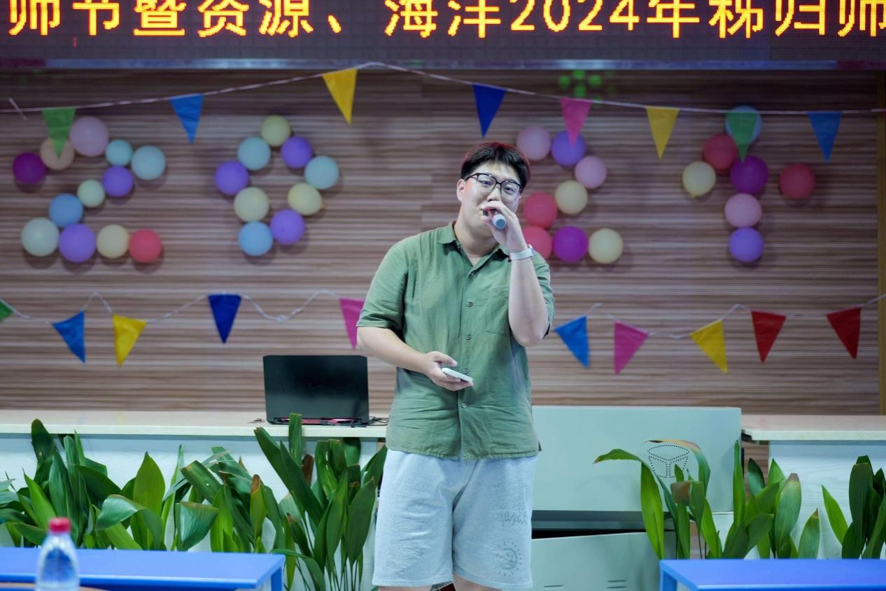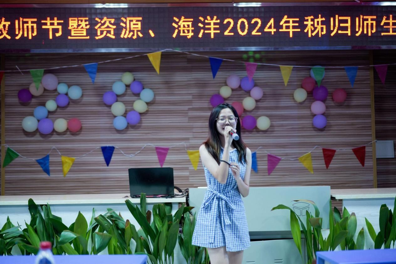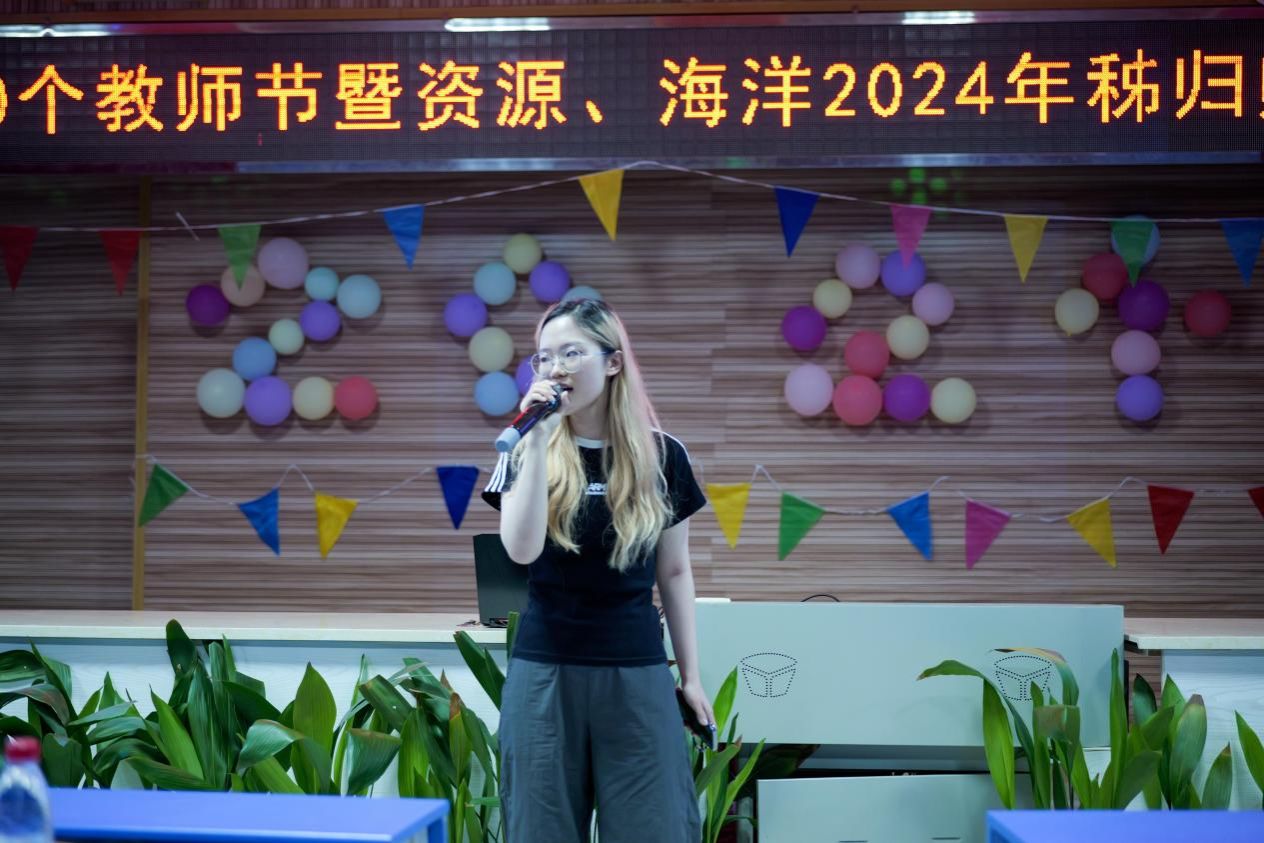 的学生们也纷纷登台,用歌声和朗诵表达了对老师的感激之情。陈大康同学以一首《落叶归根》深情地表达了对家乡的眷恋与对师恩的感念;金涵翔、孙岳璐、陈权和李一鸣四位同学共同朗诵的《赞美》,则以诗为媒,展现出对老师无尽的敬仰与感激之情;王宣淳同学的《告白气球》以甜美浪漫的旋律传递出青春的美好与纯真;吴君同学的《海芋恋》则带领师生们穿越城市的喧嚣,感受海风的轻拂与海浪的低语;张浩扬同学演唱的《学不会》,歌声婉转悠扬,蕴含着脉脉深情。