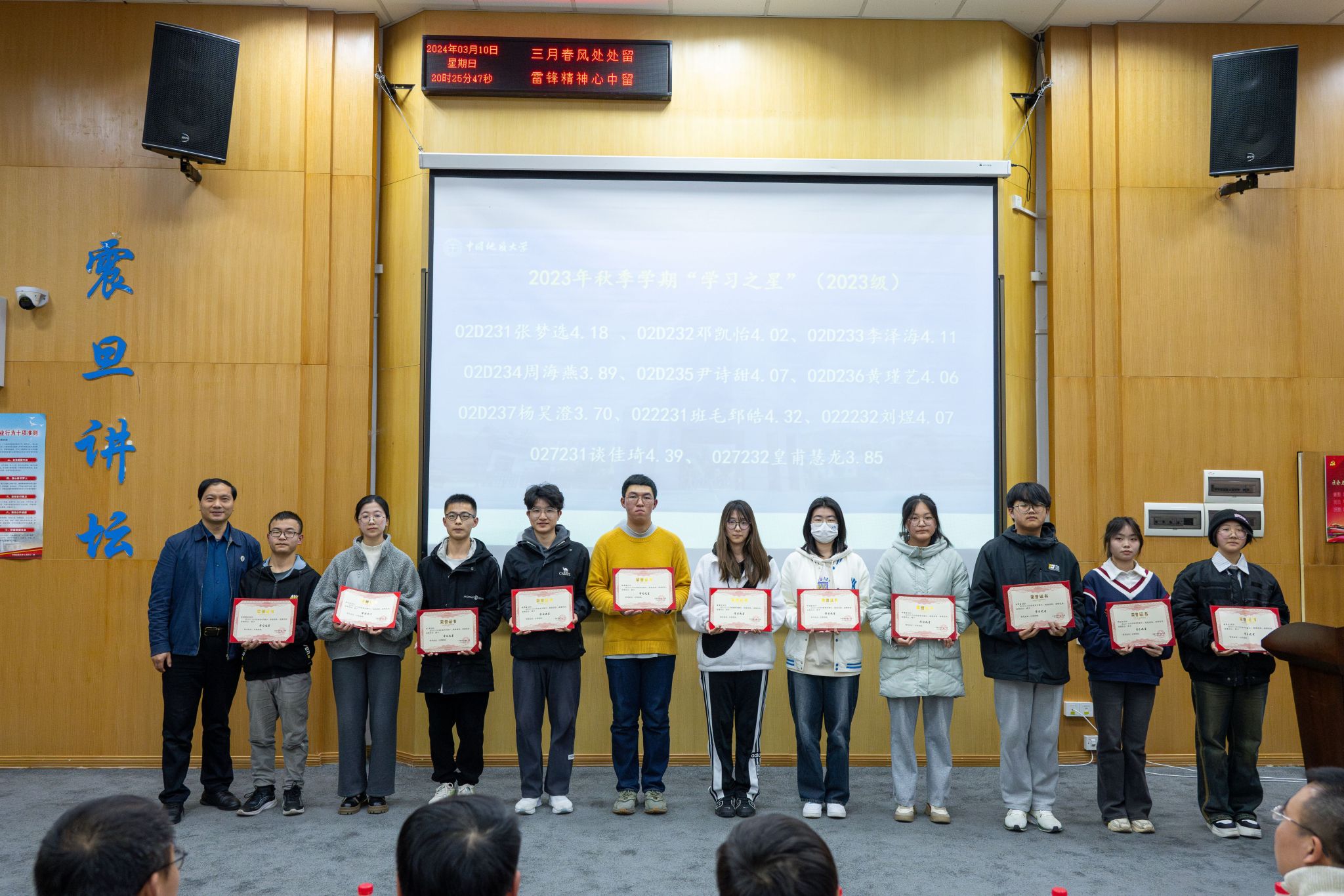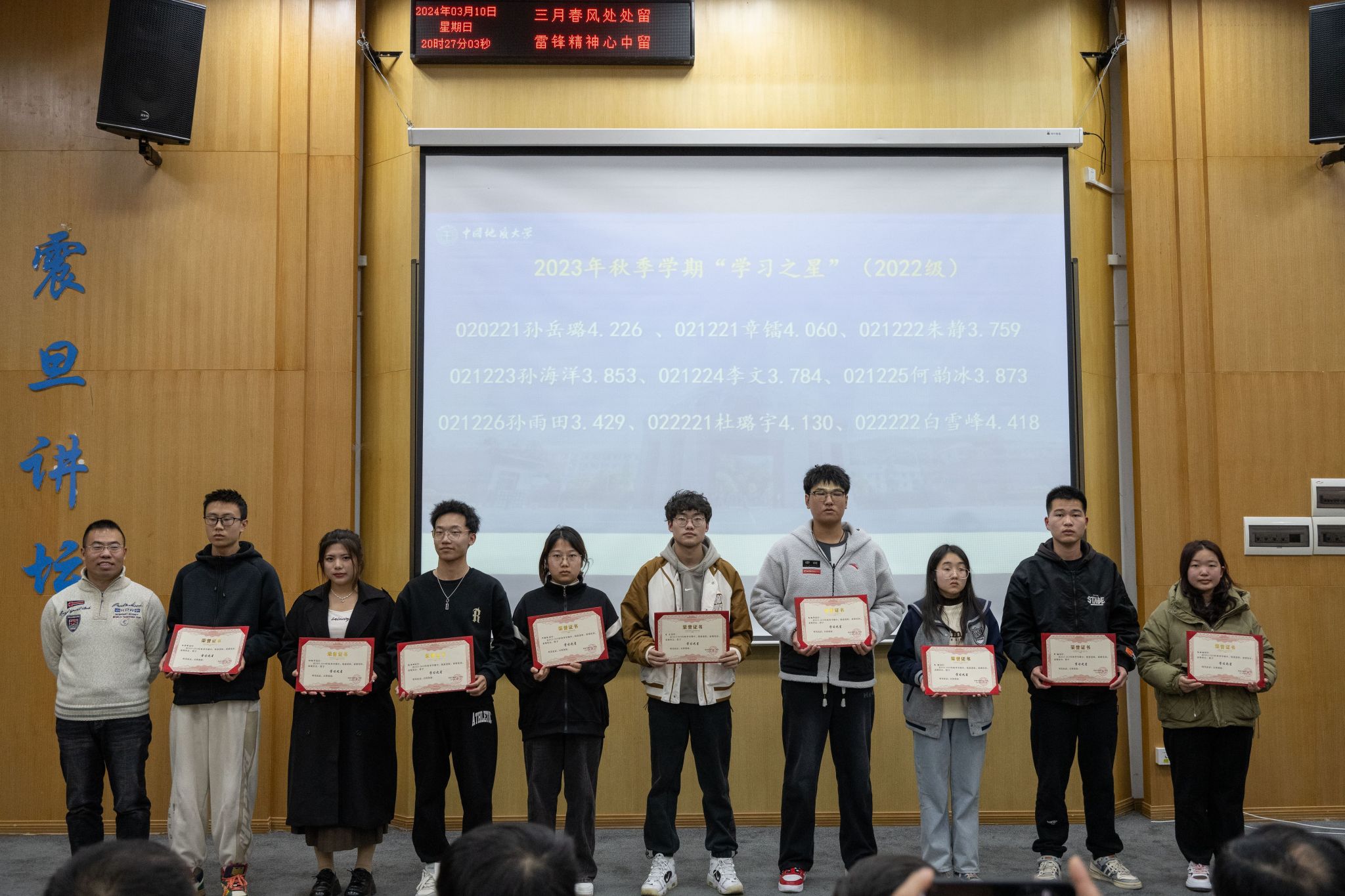 零挂科班级027231班班主任梅红波、020221班班主任张鹏飞分别为2023级、2022级“学习之星”获奖同学颁发荣誉证书。