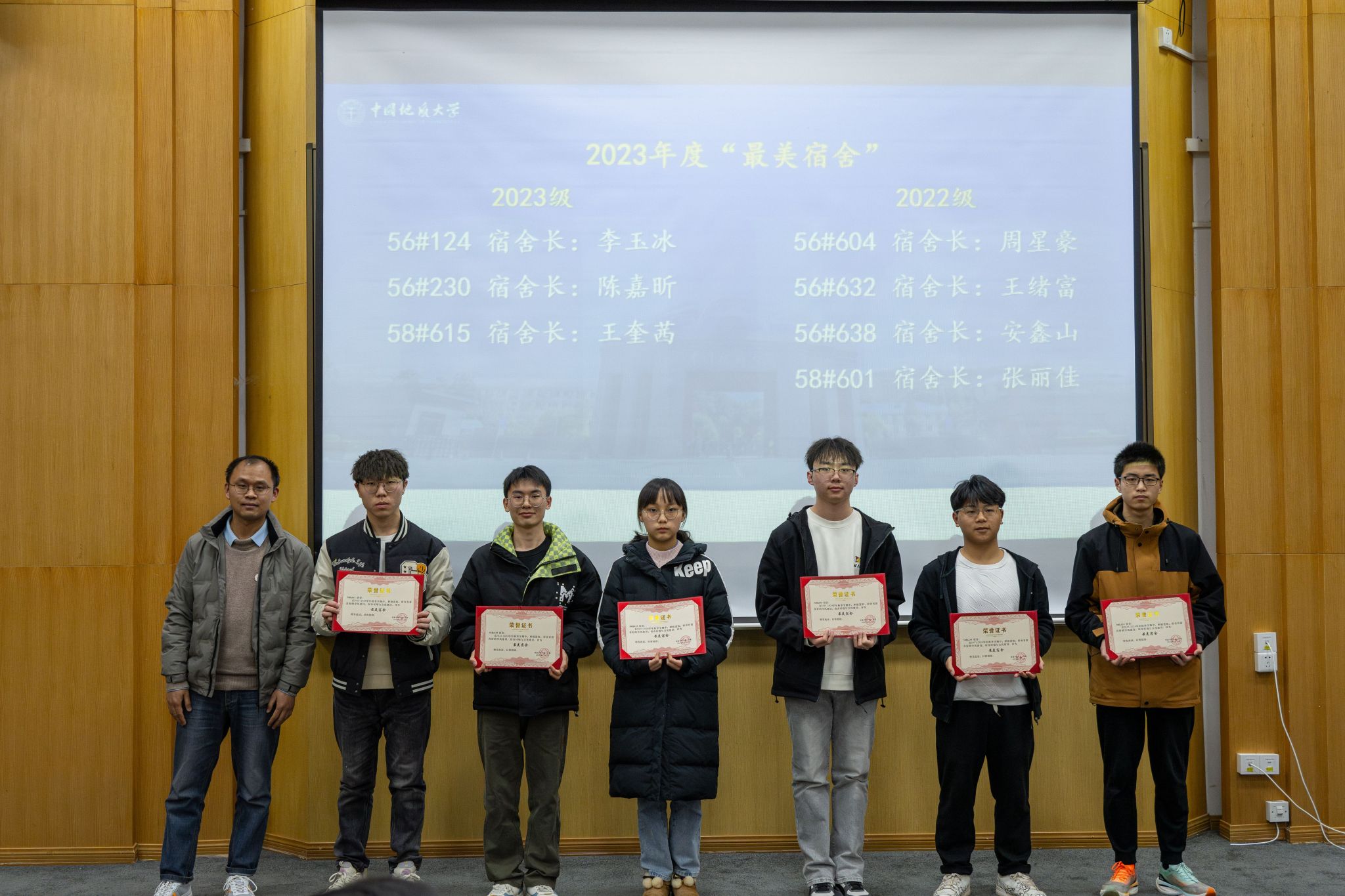 早锻炼先进班级022231班班主任孙艳坤为2023年度获得学校“百佳宿舍”的宿舍长颁发“最美宿舍”荣誉证书。