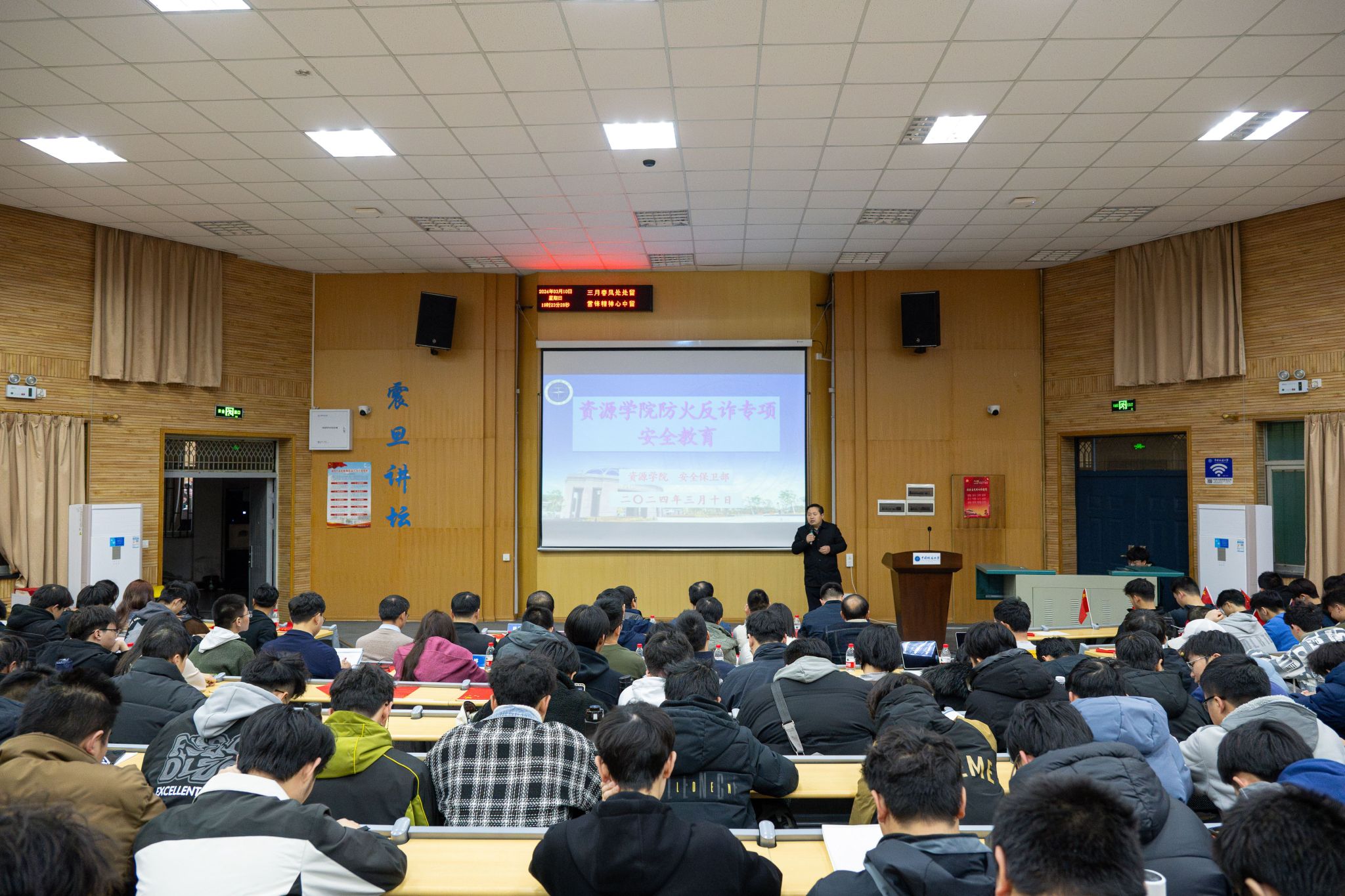 安全保卫部彭红进、魏景明两位老师分别从消防安全教育和防电信网络诈骗教育进行介绍。