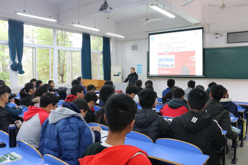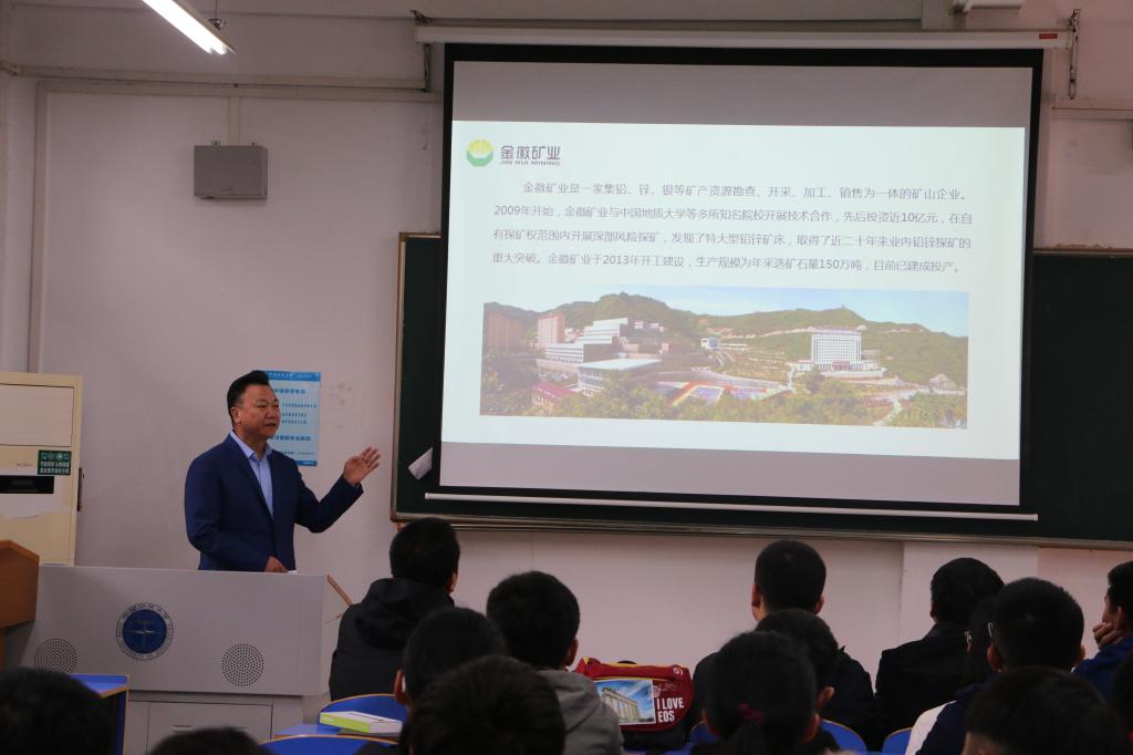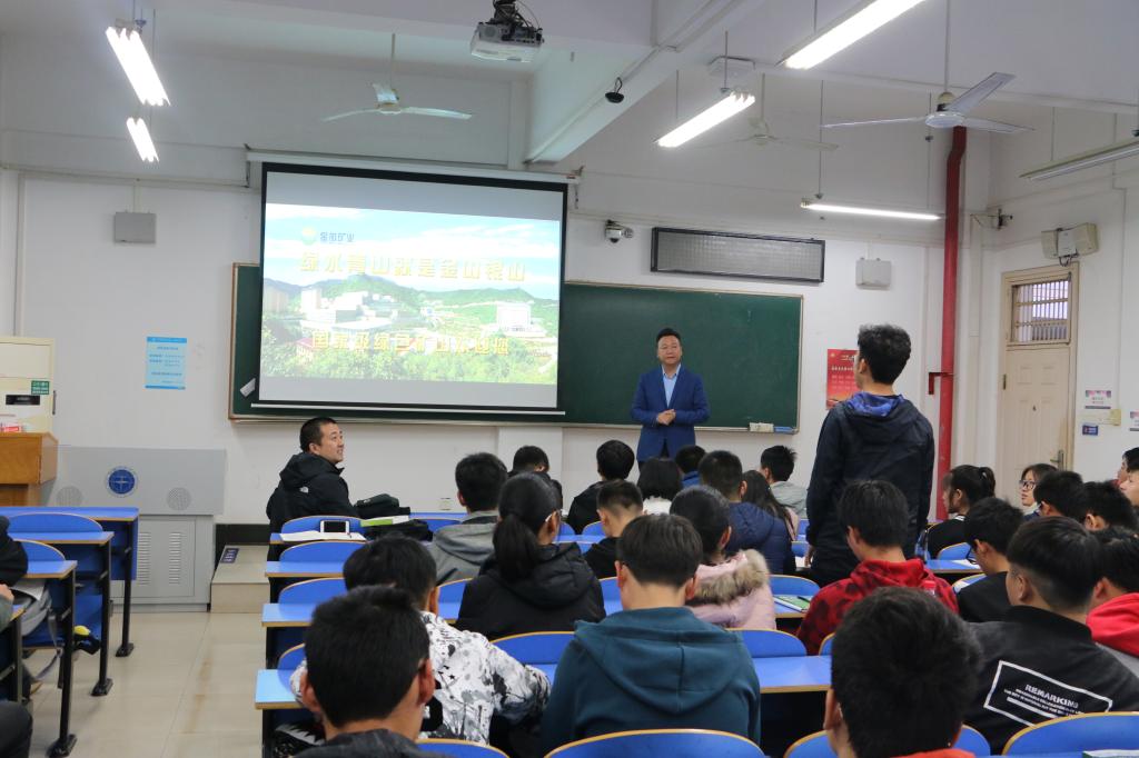 张建华简要介绍张世新基本情况后,张世新从金徽矿业公司的概况入手为大家开讲。对矿山的艰难发现、全面建设、扎实发展、长远目标几个方面的内容,张世新为在场师生进行了详细的介绍。张世新指出,金徽矿业公司从成立之初起就非常注重“绿色发展,生态立矿”,一直一来坚持节能环保,打造绿色矿山。公司对科技创新的重视也是长期坚持的战略,为公司未来的发展积蓄力量。张世新表示,公司特别注重对员工的关怀,从住房、教育、培训、休假疗养等各方面保障员工权益。