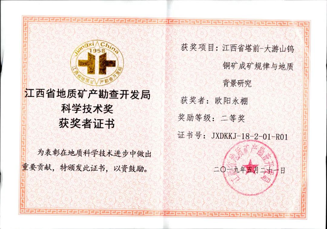 科学技术奖一等奖、江西省地矿局科学技术进步特等奖、全国质量信得过班组。