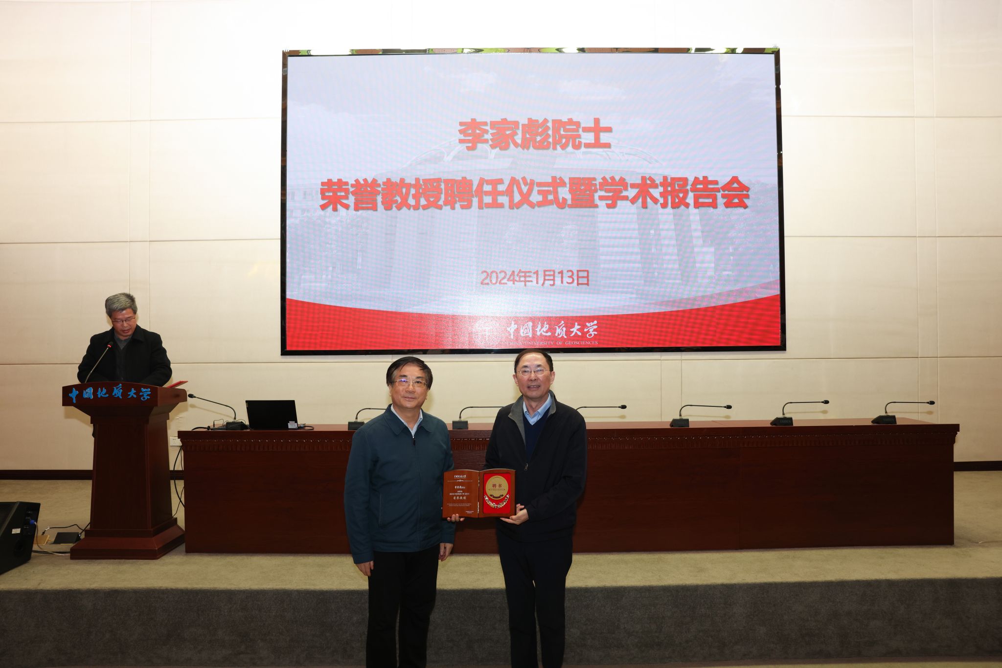 王焰新向李家彪颁发荣誉教授聘书。