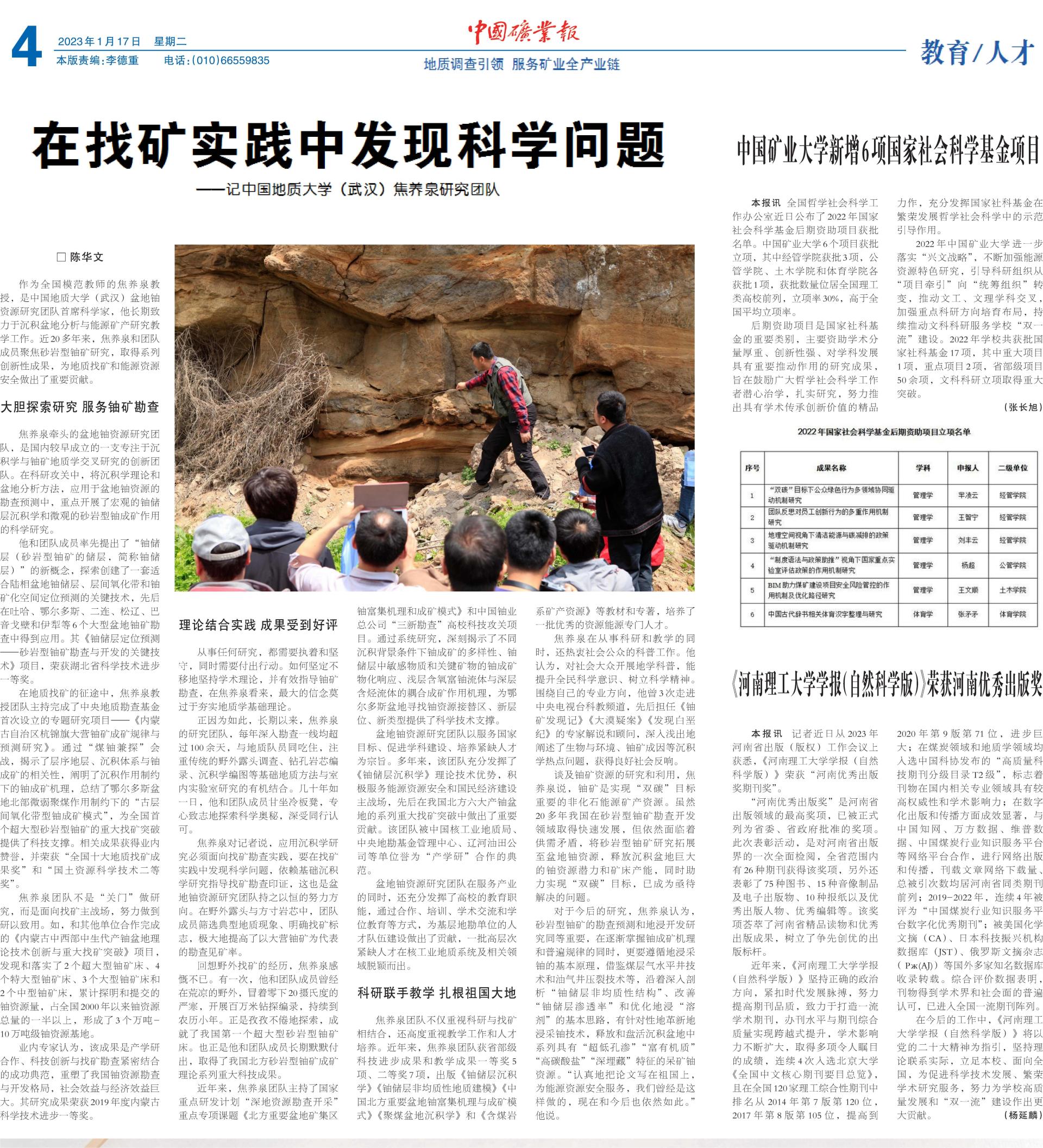在地质找矿的征途中,焦养泉教授团队主持完成了中央地质勘查基金首次设立的专题研究项目——《内蒙古自治区杭锦旗大营铀矿成矿规律与预测研究》。通过“煤铀兼探”会战,揭示了层序地层、沉积体系与铀成矿的相关性,阐明了沉积作用制约下的铀成矿机理,总结了鄂尔多斯盆地北部微弱聚煤作用制约下的“古层间氧化带型铀成矿模式”,为全国首个超大型砂岩型铀矿的重大找矿突破提供了科技支撑。相关成果获得业内赞誉,并荣获“全国十大地质找矿成果奖”和“国土禁漫天堂